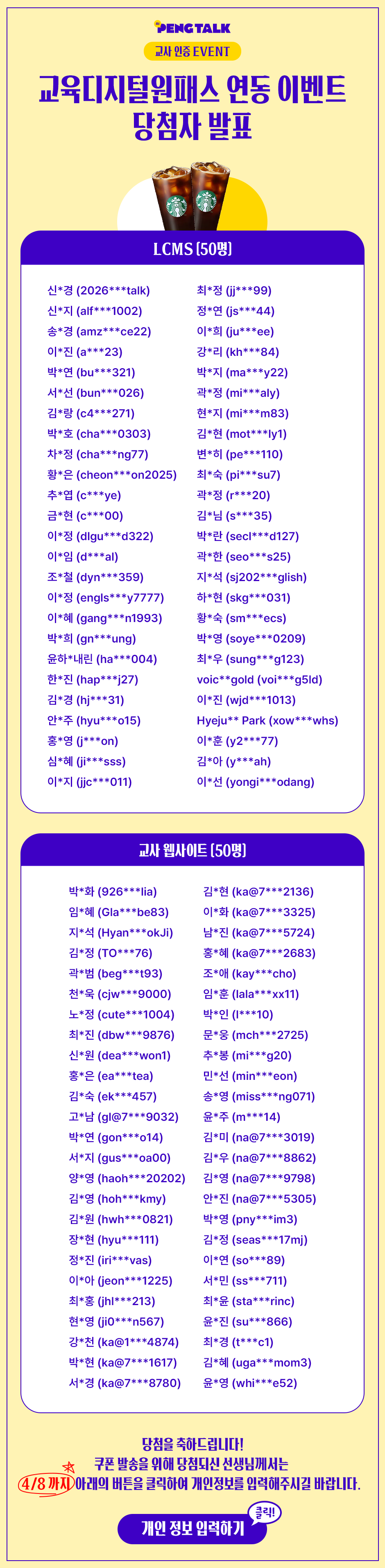 [교사용] 교사 인증 이벤트: 교육디지털원패스 연동하고 커피 쿠폰 받자! 당첨자 발표