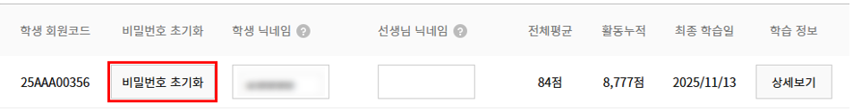 AI 펭톡 교사 페이지 > 학습현황에서 해당 학생 회원 코드의 [비밀번호 초기화]를 선택해주세요.