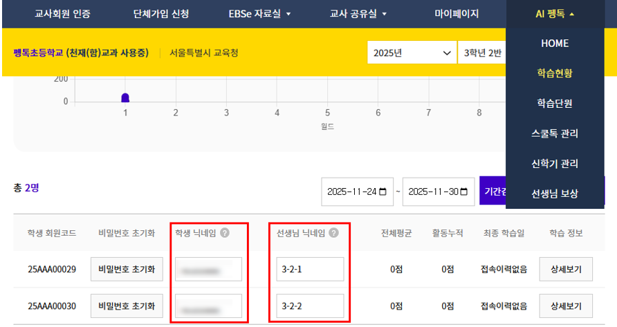 학생 닉네임과 선생님 닉네임은 'AI 펭톡 선생님 사이트 > 학습 현황'에서 확인하실 수 있습니다.