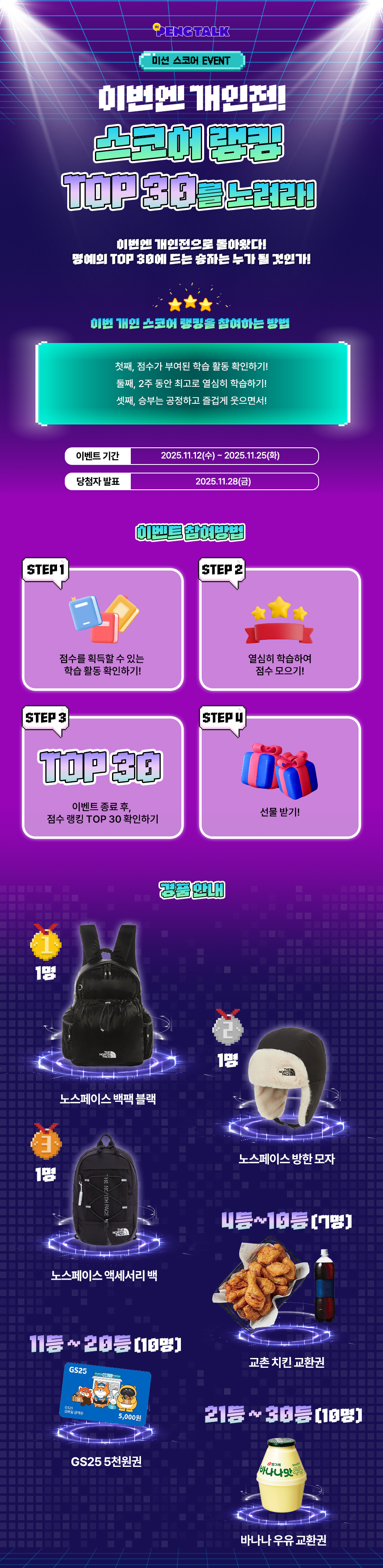 11월에는 지난 9월 학급 단위로 진행되었던 스코어 랭킹 이벤트가 개인전으로 새롭게 진행될 예정입니다.