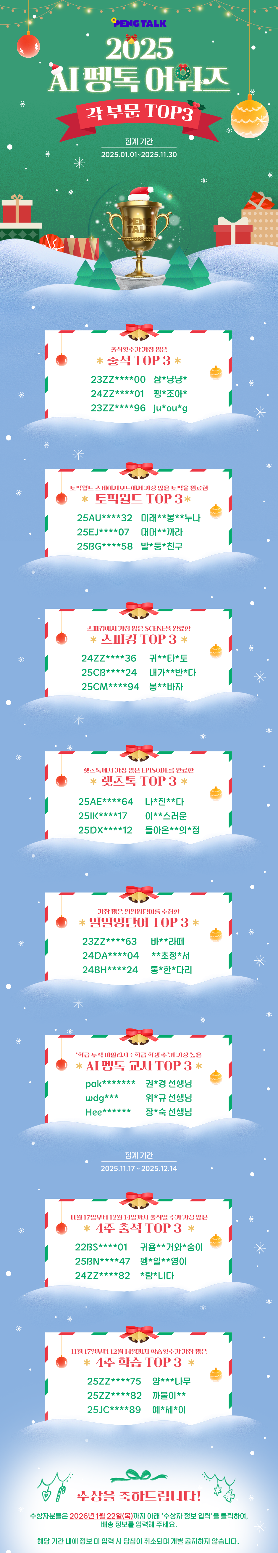 지난 11월에 안내드렸던 <2025 AI 펭톡 12월 어워즈 수상자> 발표가 아래와 같이 공지되었습니다.